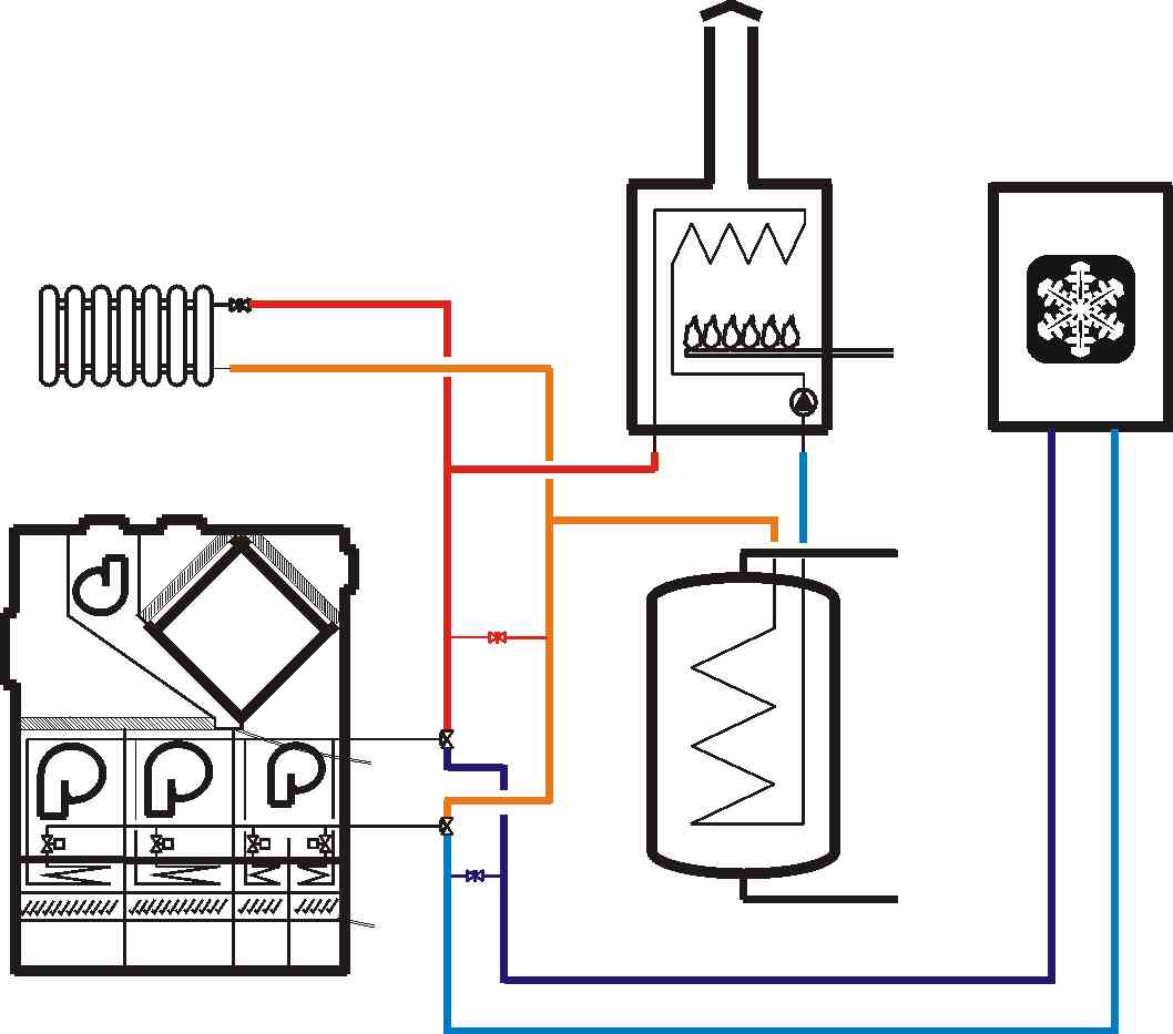 Kälteerzeuger Die entzogene Wärme wird vom Kälteerzeuger an die Umgebung abgegeben. Deshalb ist sein optimaler Standort im Freien. Dabei ist darauf zu achten, dass das Betriebsgeräusch nicht störend wirken kann. Der Kühlwasserkreislauf ist bei dieser Anordnung des Kälteerzeugers im frostgefährdeten Bereich mit einer automatischen Begleitheizung auszurüsten, damit eine Entleerung der Leitungen im Winter entfallen kann. Wir empfehlen, den Kühlwasserkreislauf separat bis vor das Luftheizgerät zu führen und durch das Drei/Zwei-Wege-Ventil dort umschaltbar zu machen. Zwischen Frischluftheizgerät und Ausblaskasten wird die Kondensatauffangeinrichtung installiert. Dadurch erhöht sich das Frischluftheizgerät um ca. 200 mm. Die luft- und wasserseitigen Anschlüsse am Frischluftheizgerät müssen angepasst werden. Alle neuen Funktionsteile sind elektrisch zu verdrahten. Anlagenfahrweise Zur Umschaltung zwischen Kühl- und Heizbetriebsart durch den Bewohner wird mindestens ein Raumtemperaturregler elektronisch mit Schaltuhr an das vorhandene Kabel angeschlossen. Normalerweise wird dieser für die Umluftzone (Wohnbereich im EG) installiert. Die Frischlufträume (Schlaf- und Kinderzimmer) können weiterhin mit den vorhandenen Raumtemperaturreglern betrieben werden, oder gegen welche mit Zeitprogrammierfunktion ausgetauscht werden. Die Ablaufsteuerung der Anlage im Kühlbetrieb erfolgt in der kleinen Luftvolumenstromstufe, solange keine Kälteanforderung ansteht. Bei anstehender Kälteanforderung wird in die maximale Luftvolumenstufe geschaltet. Der Luft/Luft-Wärmetauscher funktioniert auch während des Kühlbetrieb und erzielt somit einen Kälterückgewinn. |
